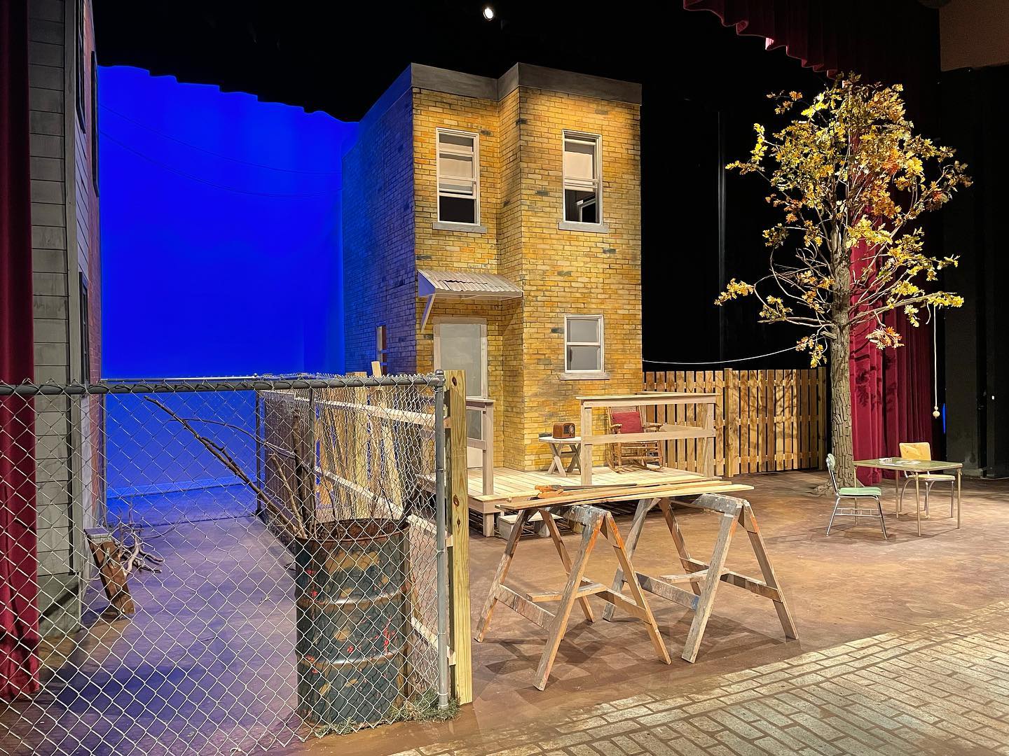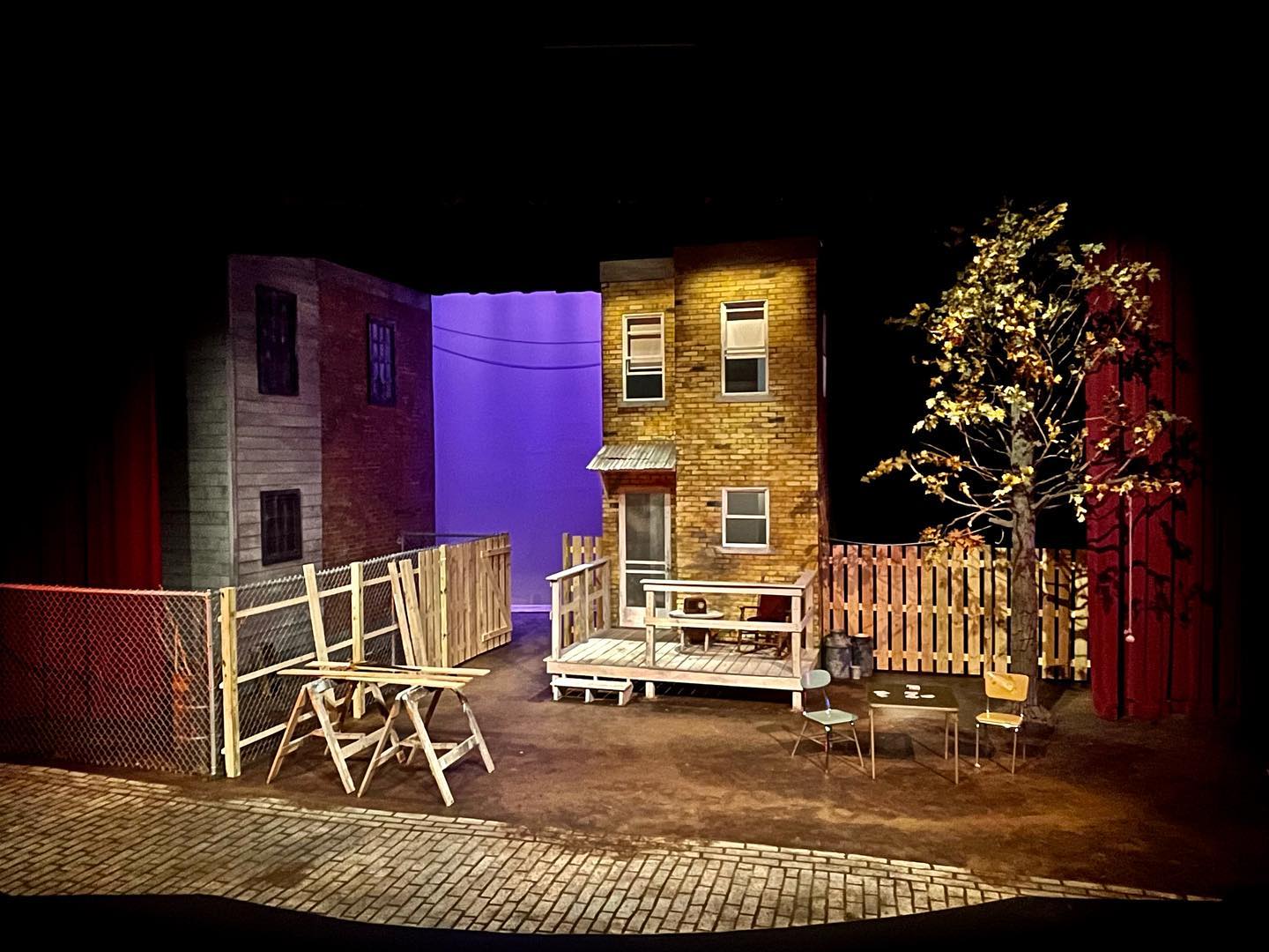 September 2021 · Urban backyard design with detailed row houses, autumn tree, brick pattern flooring, and chain-link fencing
